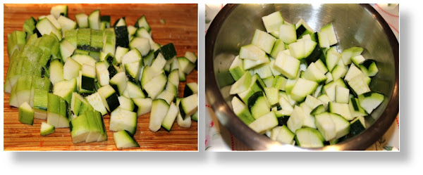 Corta a dados pequeños los calabacines y añade sal al gusto. Reserva.