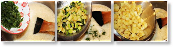 Aparte, casca los huevos en un bol grande y añade una "pizca" de sal. Bate enérgicamente hasta que el huevo espume. Seguidamente incorpora el pimiento verde, el calabacín y las patatas.