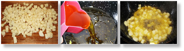Añade a la misma sartén abundante aceite para freír las patatas a fuego medio-alto. Le agregué 250 ml. más a la que ya tenía. No deberán cocerse pero sí freírse sin llegar a dorarse. NO TAPES LA SARTÉN.