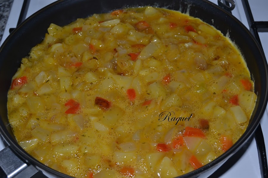 Echamos las patatas lo mezclamos todo bien y hacemos la tortilla al gusto a mi me gusta bien hecha que no se vea el huevo crudo pero eso va a gustos, a si que tu a tu gusto.