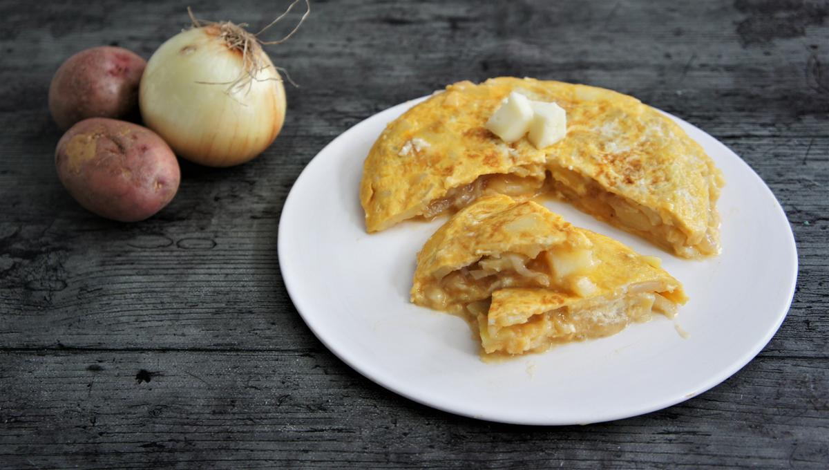 Doramos unos minutos a fuego medio-alto y cuando veamos que está cremosa le damos la vuelta con ayuda de un plato (es importante que sea llano y bastante más grande que la sartén para que no se nos caiga) y dejamos que se tueste por el otro lado. Si queréis que quede cremosa con un par de minutos es suficiente, si os gusta bien cuajada dejadla más tiempo.