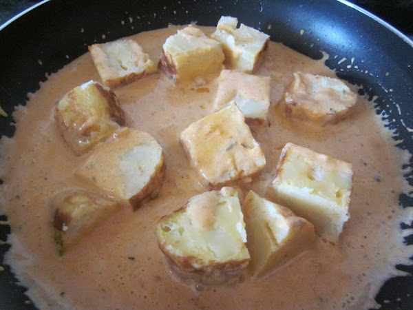Añadimos la salsa de tomate y el vino y cocemos unos minutos, añadimos estragón y nata (crema de leche), y echamos la tortilla bien en un trozo grande o en trocitos, dejamos que empiece a hervir, rectificamos de sal y pimienta y listo para comer.
