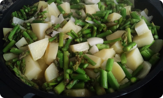 Mientras, trocea los espárragos e incorpora a la sartén.