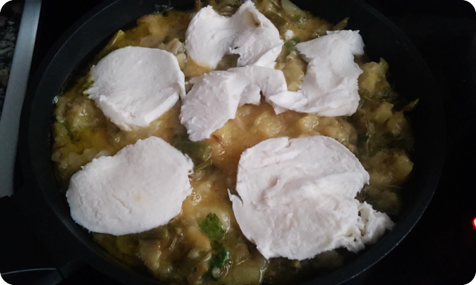 Remueve y vuelve a tapar para que se hagan a la vez que las patatas. Da vueltas de vez en cuando. Vuelve a colocar la tapadera.