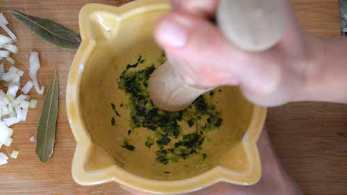 Y ahora viene lo mejor. Aprovechar la tortilla del día anterior. Porque en mi casa no se tira nada y porque esta receta saca lo más rico de la tortilla que tenemos un poco reseca. Así le vamos a sacar mucho partido.Así que en un mortero, primero agregamos un diente de ajo, un poco de sal y un puñado de perejil fresco. Lo machacamos con el palo del mortero hasta obtener una pasta homogénea. Lo reservamos.