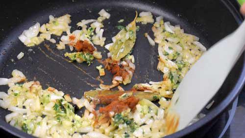 Rehogamos por un par de minutos a fuego medio, echamos unas cuantas de pimientas en grano o pimienta molida, un par de hojas de laurel y dejamos sofreír hasta que la cebolla se ponga transparente.