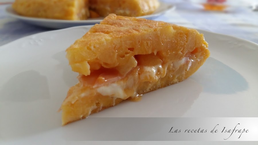 Echamos un chorrito de aceite de oliva en la sartén donde vayamos a hacer la tortilla, ponemos al fuego y una vez caliente echamos la mitad de la mezcla de huevos y patatas, encima disponemos las lonchas de jamón y sobre éstas las de queso y tapamos con el resto.