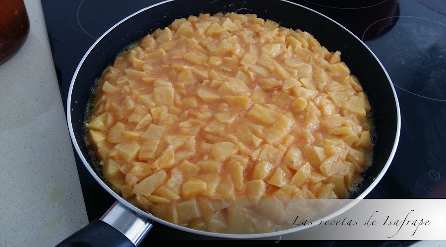Una vez hecha por abajo damos la vuelta a la tortilla para que se haga por la otra parte. Os recomiendo no ponerlo a fuego muy fuerte para que no se queme por fuera y quede demasiado cruda por dentro, pero eso al gusto.