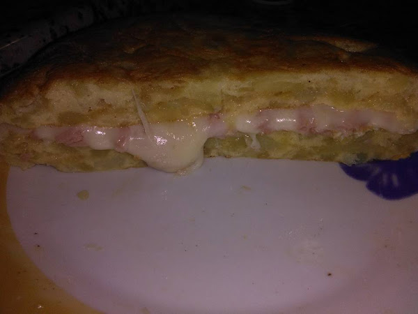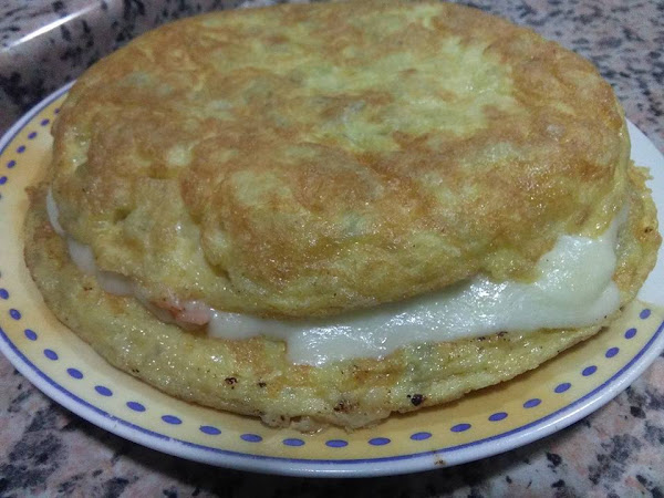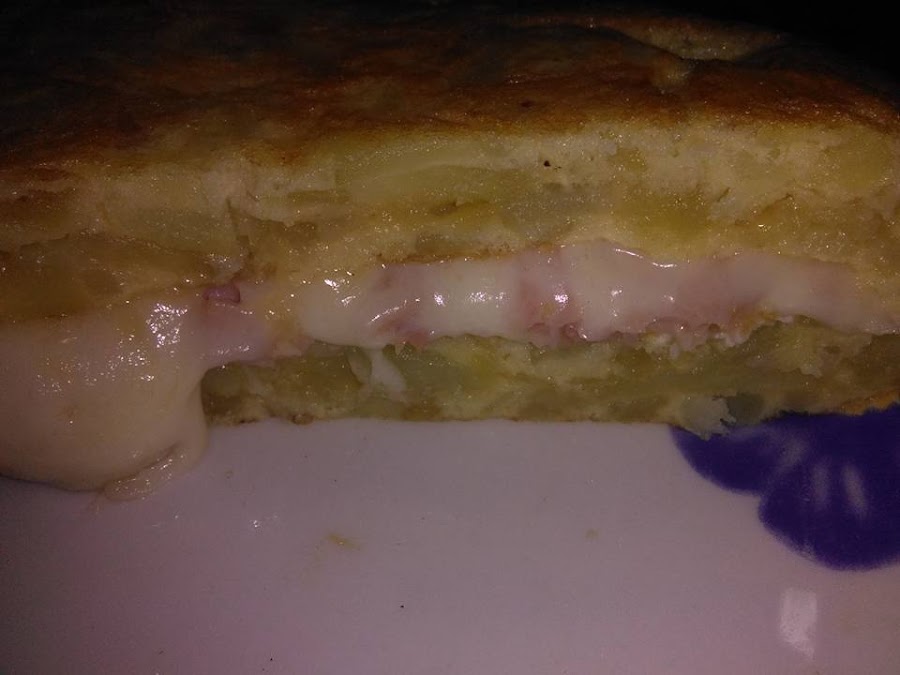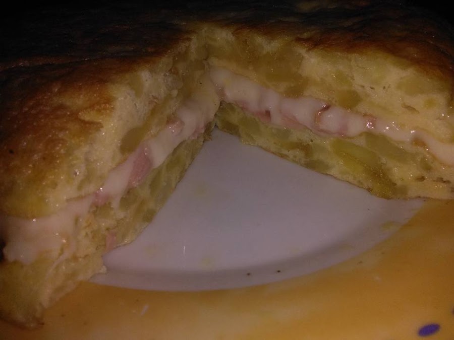 Preparamos dos tortillas de patatas de manera habitual pero no muy gruesas y, cuando estemos acabando la segunda, le ponemos encima el queso y el jamón.
