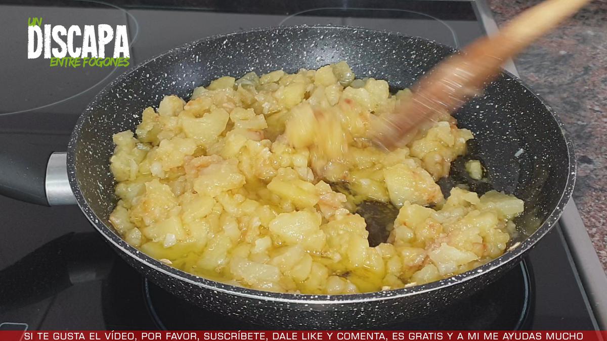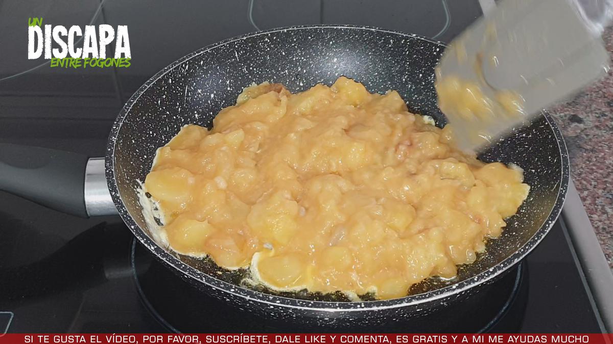 Cuando el aceite ya está caliente añadimos la mitad de la mezcla de las patatas y huevos.