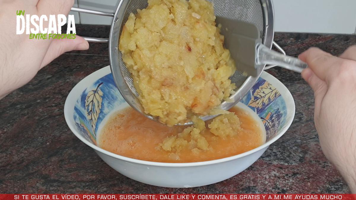 5Ahora ponemos las patatas en un colador para que se escurra el exceso de aceite y las mezclamos con los huevos.