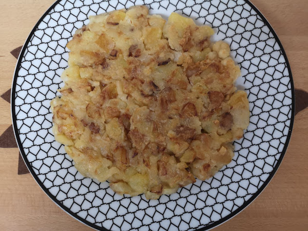 Mientras freir las patatas con la cebolla y los ajos picados.