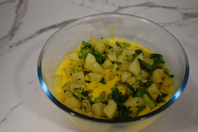Metemos en el bol las patatas con la cebolla y el bimi, escurrir si tiene restos de aceite.