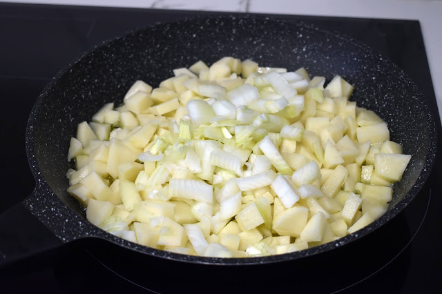 Pelamos las patatas y hacemos a trozos pequeños, yo las corto a cuadraditos pequeños.