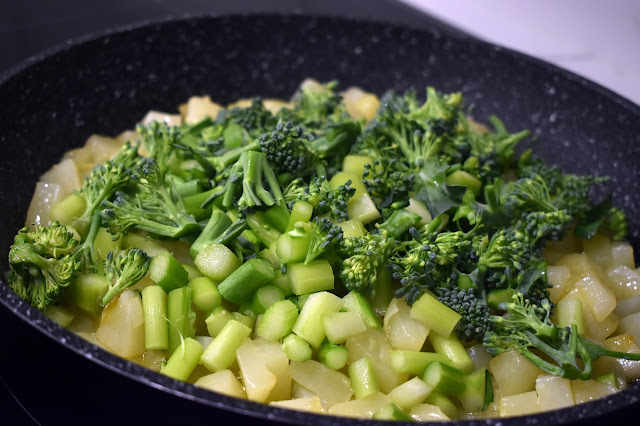 Cuando la patata se vea ya tierna y ya casi hecha pero aun no se vea ese tono dorado, añadiremos el bimi, en pocos minutos estará listo.