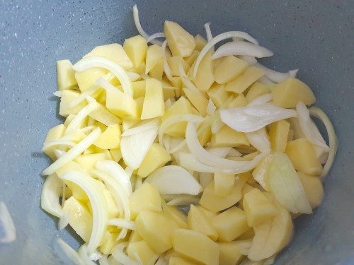 3- Poner en la cubeta el aceite, las patatas, la cebolla, el agua y 1 cucharadita de sal y remover bien para que se impregne todo.