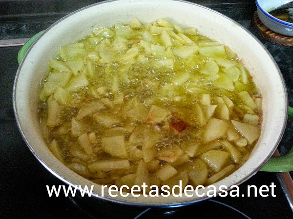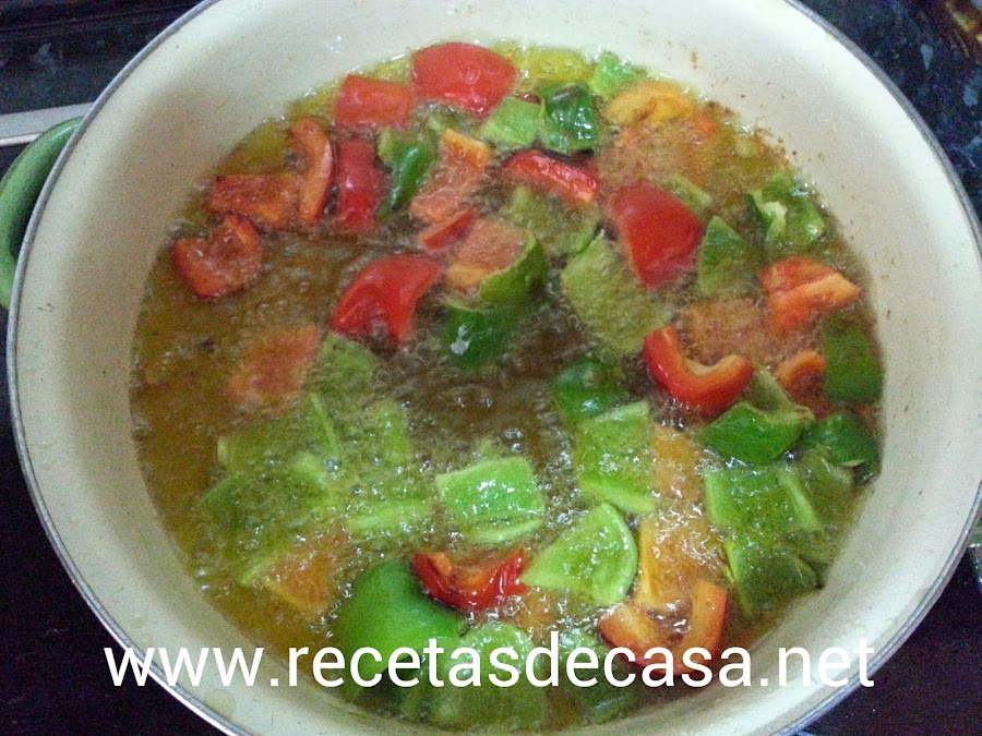 En el mismo aceite, freímos los pimientos cortados a cuadrados.