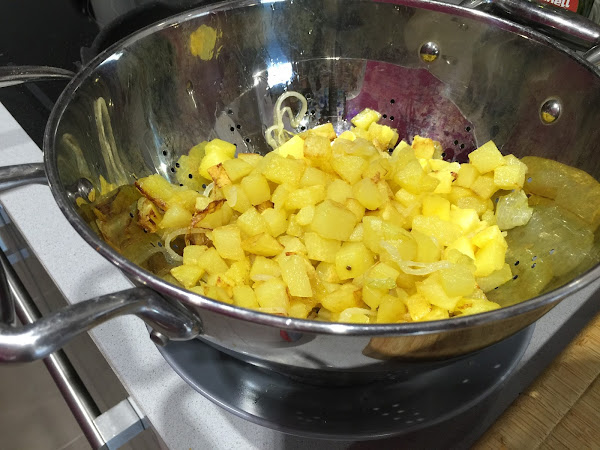 4. Para evitar el exceso de aceite en casa siempre ponemos las patatas en el escurridor y debajo un plato hondo para aprovechar el exceso de aceite que caiga. Dejamos reposar las patatas 20 minutos.