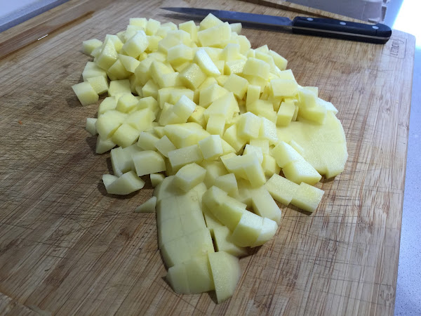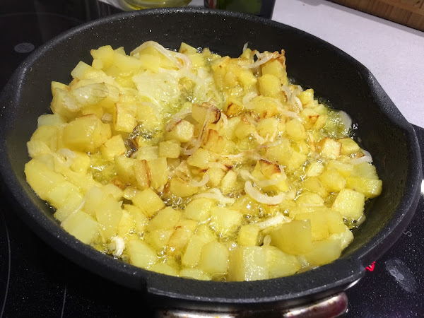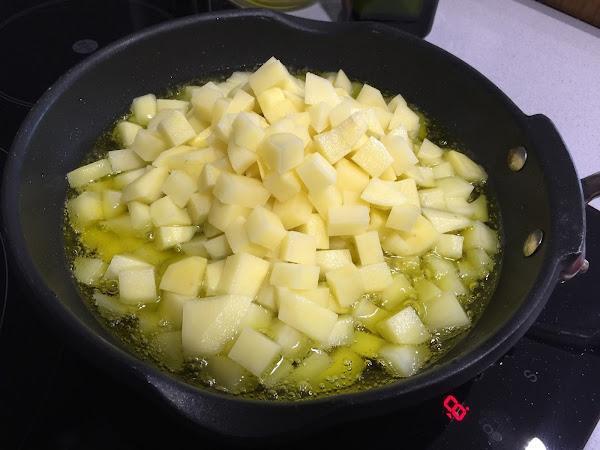 1. Pelamos y cortamos en cuadraditos las 6 patatas. Ponemos abundante aceite de oliva virgen extra en una sartén, a fuego medio alto empezamos a freír las patatas.