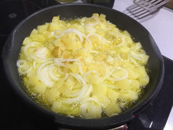 2. Cuando las patatas lleven unos 5 minutos en el fuego, pelamos y lavamos la cebolla blanca. Con una mandolina y sobre la sartén cortamos en rodajas finas la cebolla. Salamos y seguimos friendo.