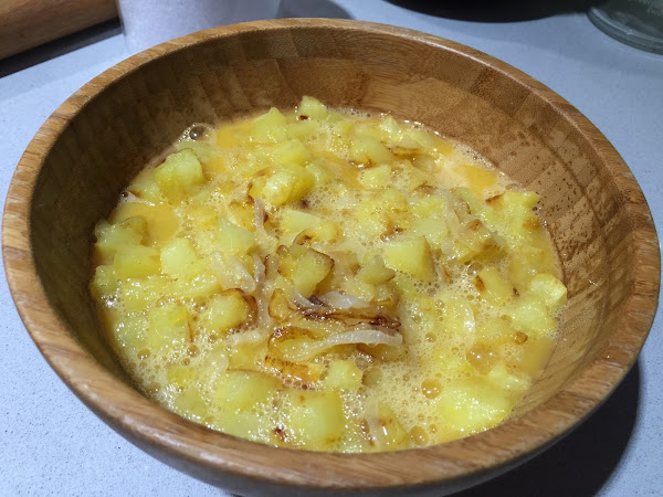 6. Añadimos las patatas y la cebolla frita al huevo batido, mezclamos hasta que se integren en el huevo por completo.