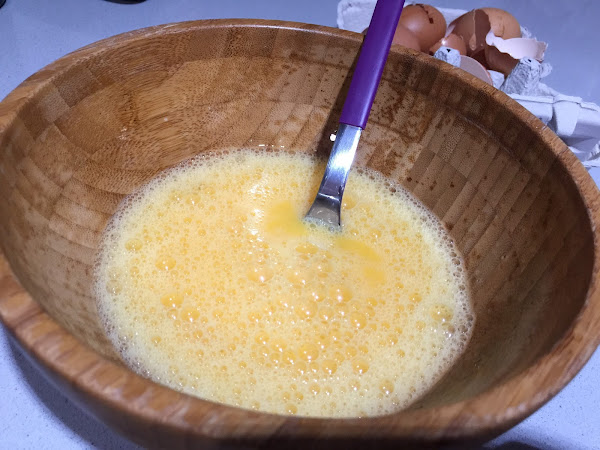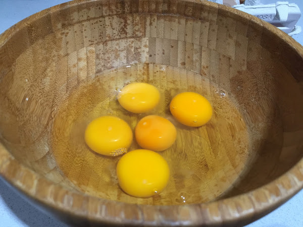 5. Al ser una tortilla para dos tan solo he puesto 5 huevos, eso sí, siempre de gallinas felices. Los batimos y salpimentamos.