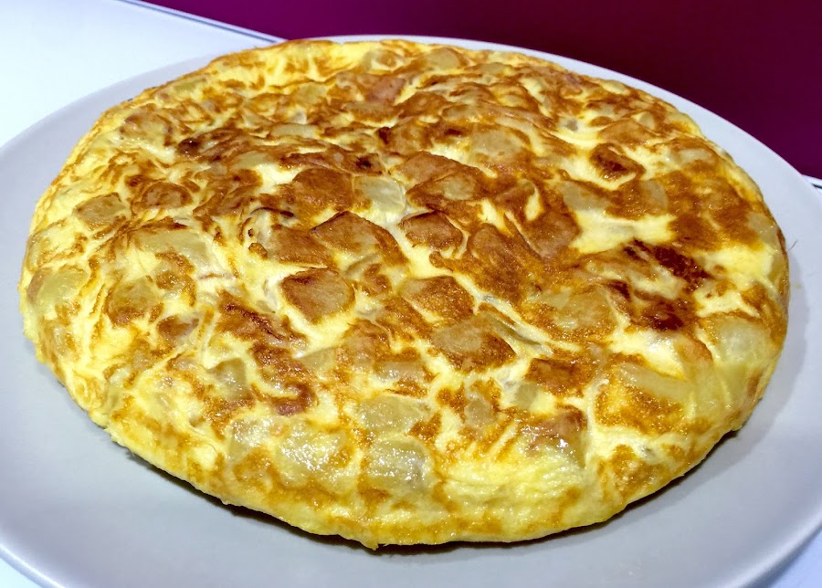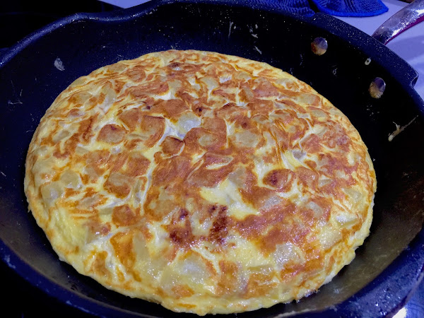 7. Echamos la mezcla a la sartén cuando esta esté caliente. En casa nos gusta la tortilla poco echa, que el huevo quede algo líquido, eso ya va a gustos. Cuando el huevo empiece a cuajar le damos la vuelta, dejamos un par de minutos más y paramos el fuego.