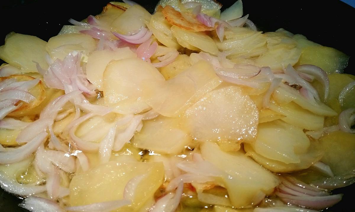 Ponemos a calentar el aceite de oliva (que no cubra las patatas) en una sarten que no se enganche los alimentos. Cuando este el aceite caliente, freimos a fuego lento y tapadas las patatas junto con la cebolla laminada o rallada.