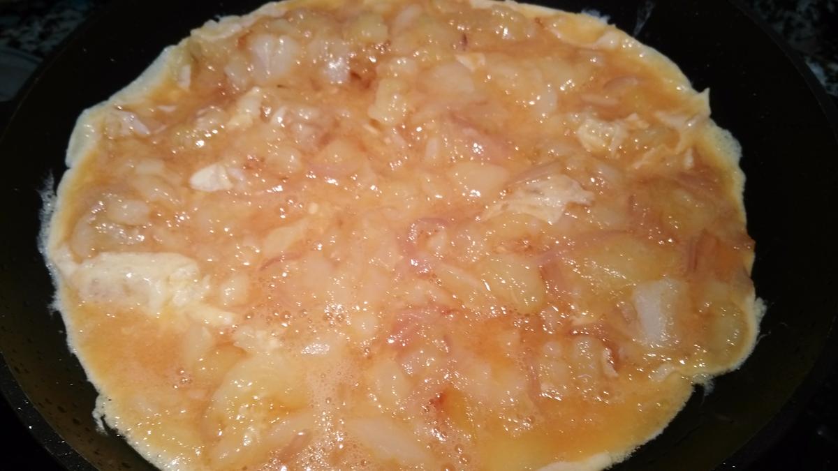 Vuelve a colocar la sartén en el fuego con un poquito de aceite, cuando este caliente aboca la mezcla de los huevos y patatas. A fuego suave deja cuajar.