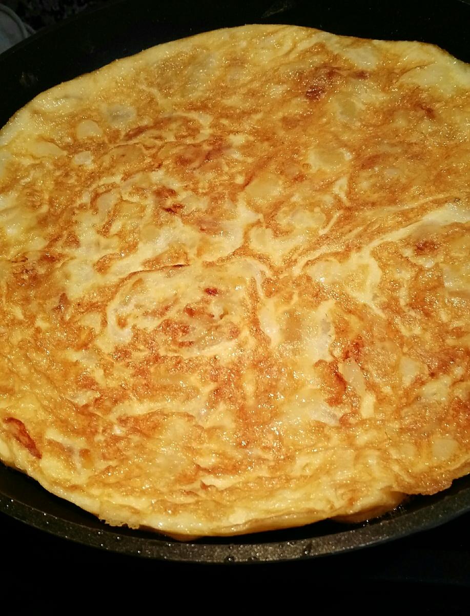 Vuelta y vuelta y ya tenemos lista nuestra riquísima tortilla de patatas con cebolla para cenar.
