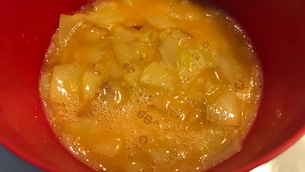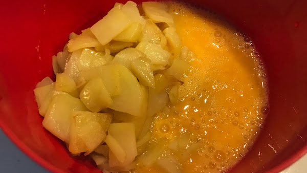 Introduce las patatas en el bol de los huevos batidos. Mezcla bien y déjalas un rato, que las patatas se empapen bien de huevo.
