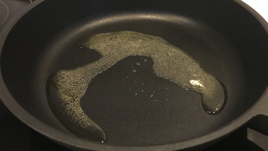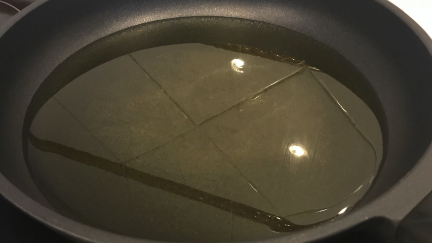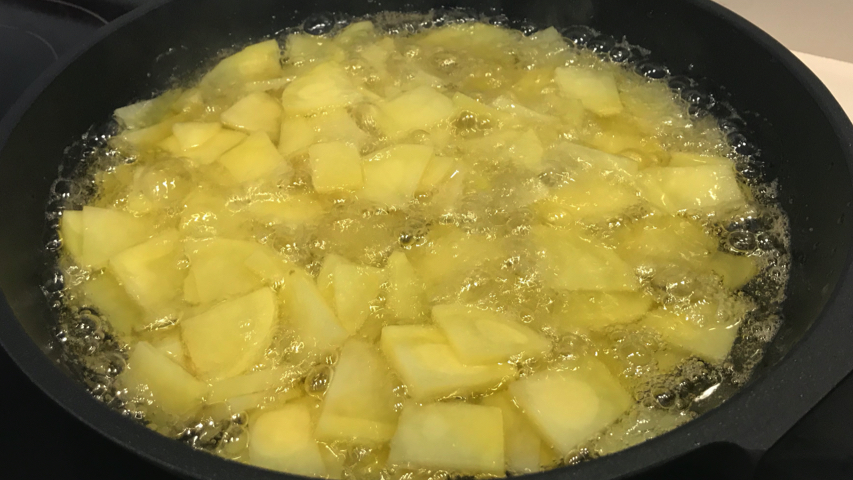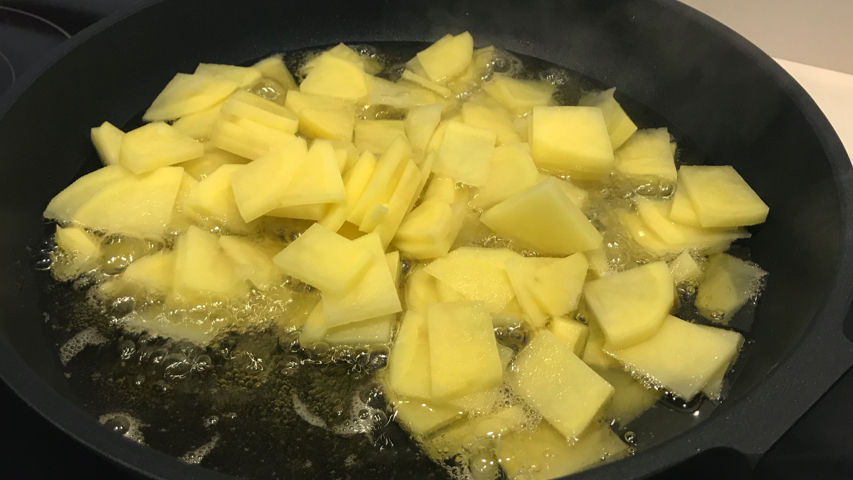 Prepara una sartén a fuego alto con un dedo de aceite de oliva, introduce las patatas.