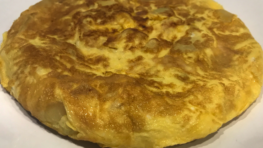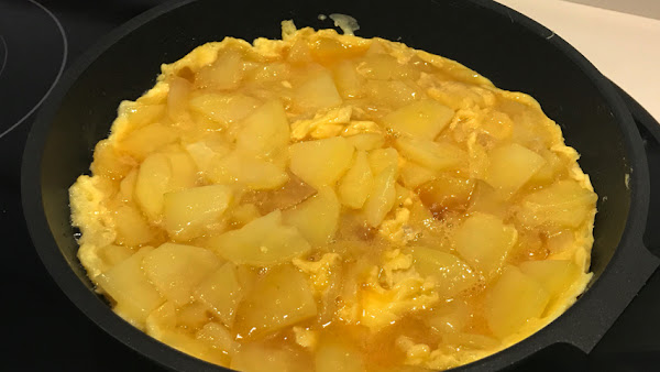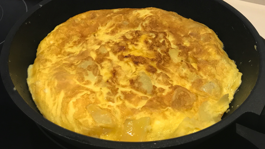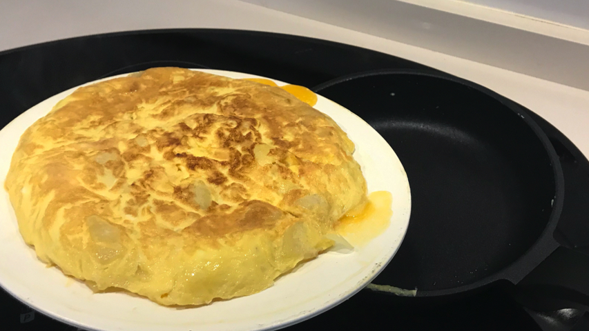 En unos 4 minutos la tortilla está hecha por la cara de abajo. Dale la vuelta usando una tapadera o un plato.