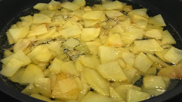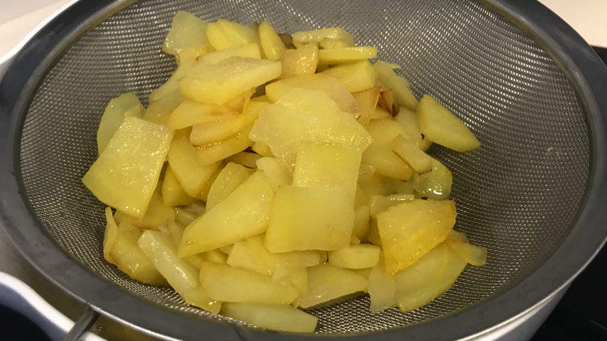 Cuando las patatas estén hechas (se rompen fácilmente, se deshacen), escúrrelas del aceite donde se han frito utilizando un colador. El aceite puedes reutilizarlo.