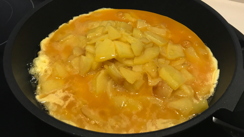 Pon a fuego fuerte la sartén donde vas a hacer la tortilla y vierte en ella la mezcla. Al principio remueve bien para que la mezcla vaya cuajando.
