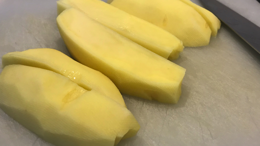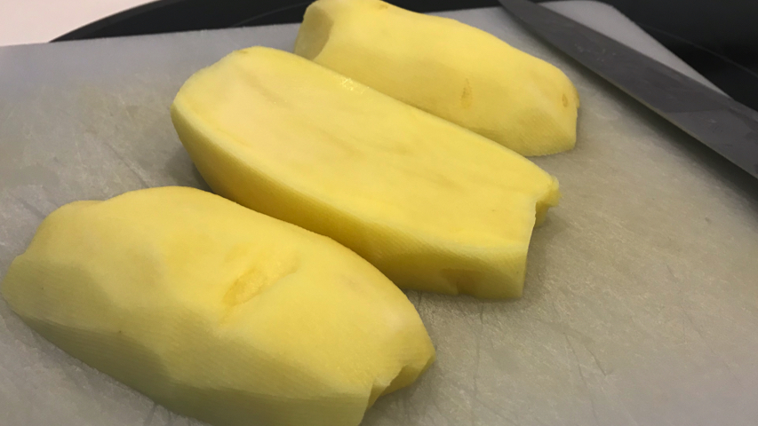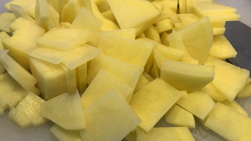 Como se ve en el vídeo, corta cada patata en 4 trozos sobre la tabla. Córtalas en finas lonchas.