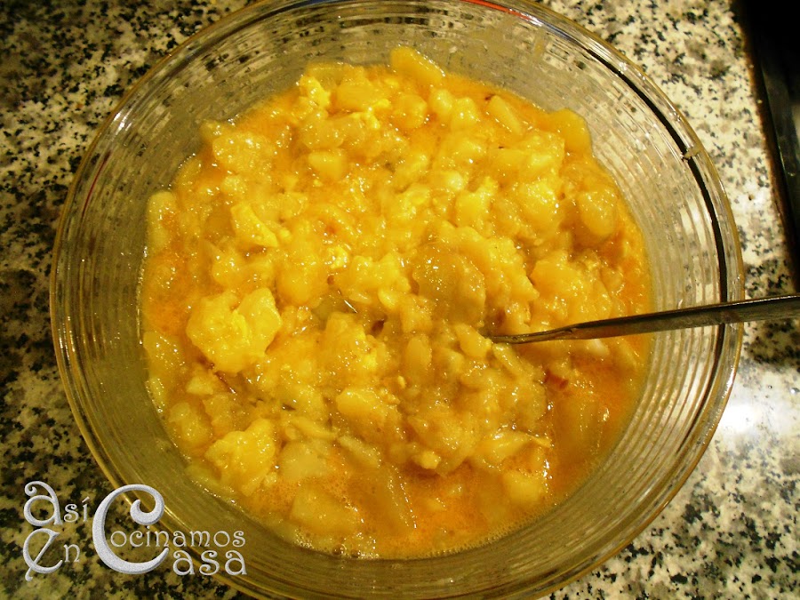 Con un tenedor mezclaremos bien patatas y huevos e incorporaremos toda la mezcla en otra sartén anti-adherente.