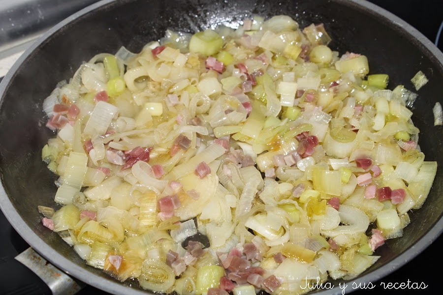 En una sarten ponemos un poquito de aceite y pochamos los puerros , cuando estén casi hechos añadimos el bacon y seguimos pochando hasta que se terminen de hacer. Dejamos que se enfríen.