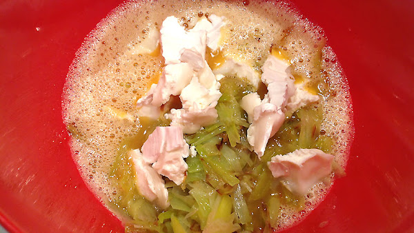 Añade al bol el puerro sofrito y el queso de cabra en trozos. Mezcla bien.