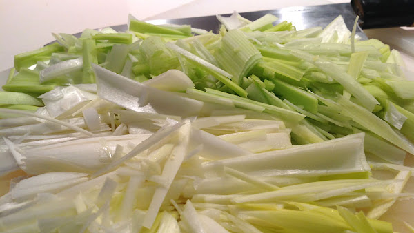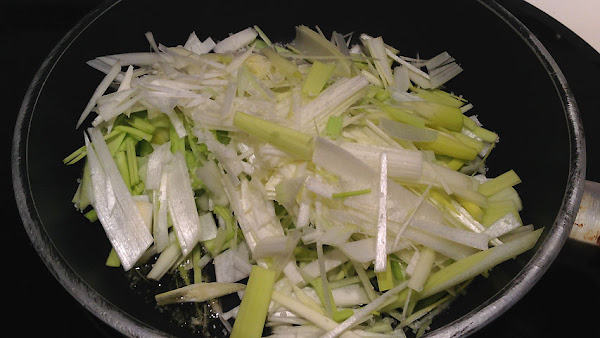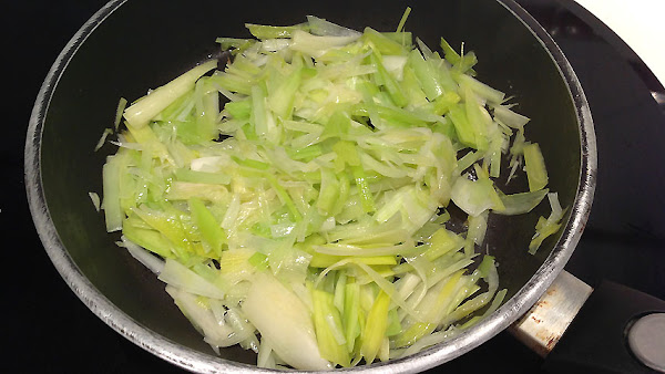 La receta se suele hacer solo con el blanco del puerro pero yo le he puesto un poco de la parte verde que creo que tiene su gracia.