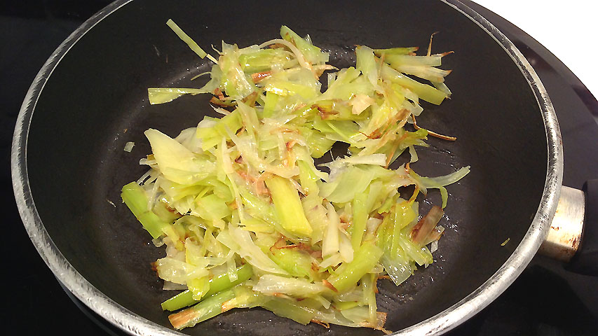 Si hubiera usado más aceite el puerro no hubiera tomado tanto color y hubiera quedado "mejor hecho" pero tendría que escurrir el exceso de aceite.
