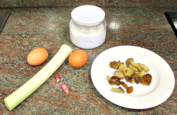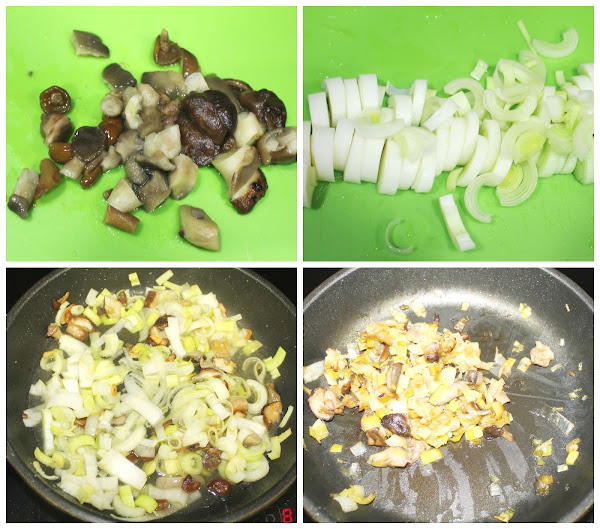 El puerro lo partimos longitudinalmente y lo pasamos por agua para quitar los posibles restos de arena, después lo partiremos en rodajas. Lo añadimos al ajo y las setas.