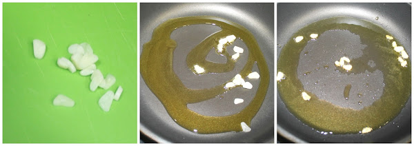 Ponemos un poco de aceite en una sartén, bien caliente, y añadimos los ajos sin dejar de remover para que no se quemen, hasta que estén ligeramente tostados.