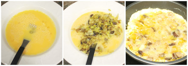 En un plato batiremos los dos huevos. Añadimos la mezcla de puerro y setas y mezclamos.