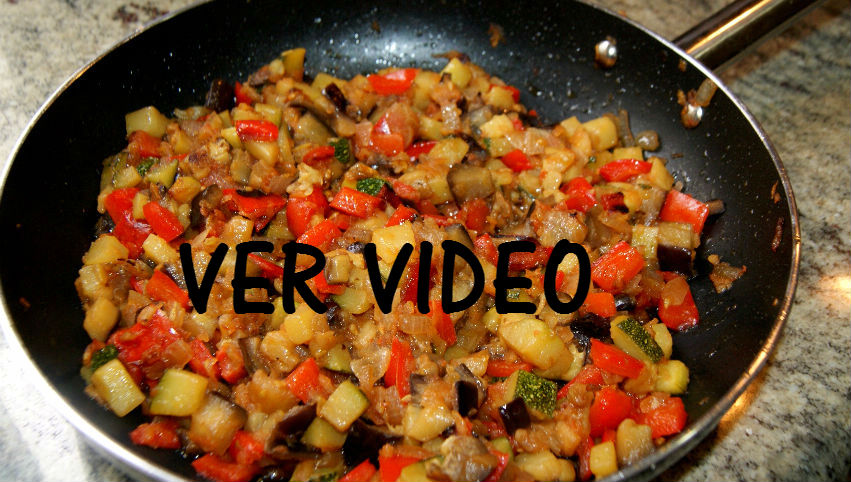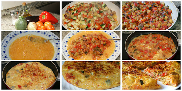 Corta las a dados pequeños la berenjena, el pimiento, la cebolla y el calabacín. En una sartén con un buen chorro de aceite de oliva, sofríe la berenjena, la cebolla y el pimiento. Sazona con sal y cuando las verduras hayan perdido gran cantidad de agua, le añades el tomate rallado. Deja que reduzca. Una vez reducido, ya se puede preparar la tortilla.