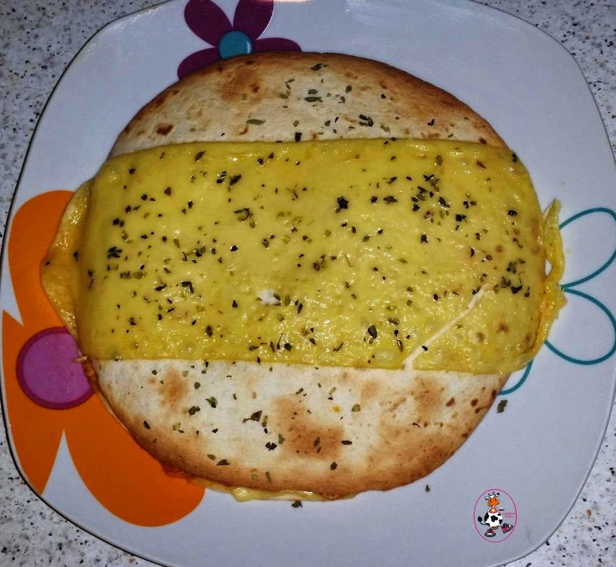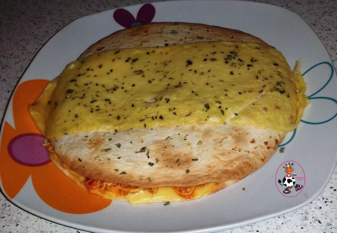 Ponemos la tortilla de trigo en un plato, colocamos queso en loncha y encima el pollo mechado tapamos con otra tortilla de trigo,ponemos una loncha de queso arriba y espolvoreamos oréganos picadito. Metemos al horno unos 10min previamente caliente a unos 200º. Sacamos y listo para comer.