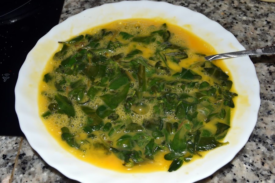 Batimos los huevos, añadimos sal y añadimos la verdolaga.