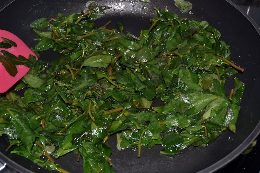 Ponemos una sartén con un poco de aceite de oliva y echamos la verdolaga.