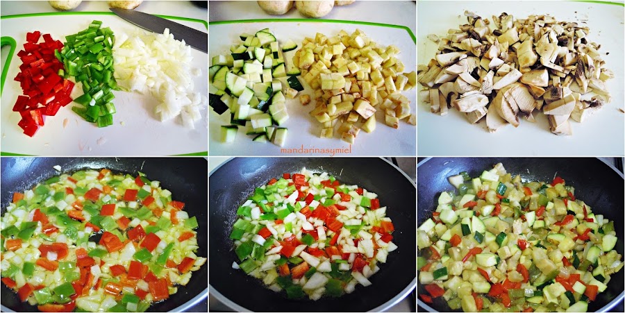Cuando estén casi hechas las verduras, añade los champiñones y deja todo junto a fuego lento hasta que se consuma el agua que puedan soltar los champiñones, unos 5 minutos.