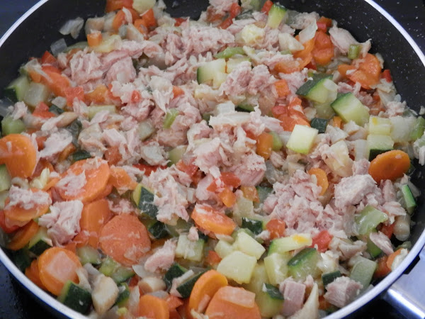 Escurrimos el aceite de las latas de atún y añadimos el atún a las verduras.